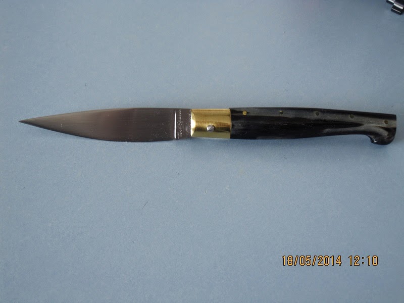 Lama da 9 cm in acciaio 12c27,manico in corno di montone nero striato ,fornimenti